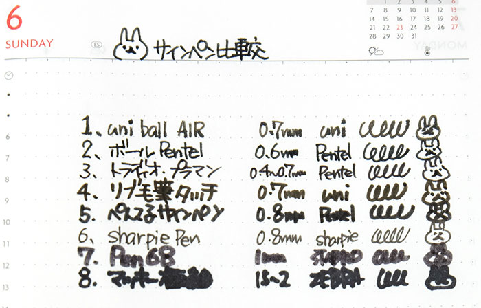 どんどんいきます! お次はサインペン・マーカーペンっぽい書き心地のペンです。ユニボールエアは厳密に言うとボールペンですが、書き味が他とは全然違うのでこちらに分類しています。