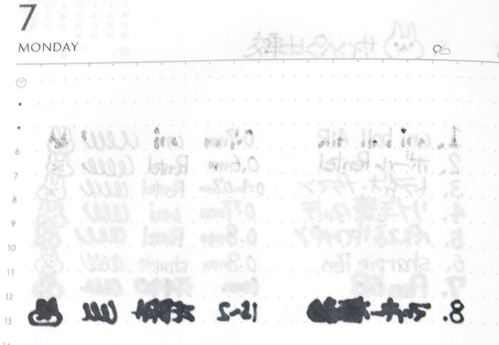 EDiT手帳が出た当初は、ペンの裏抜けが激しかったのでサインペンも裏移りするのかなーと思いつつ…試した結果!裏移りはほとんどなかったです。これは驚き…!