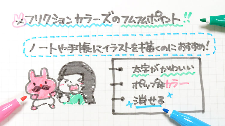 ノートや手帳に可愛いイラストを描くなら「フリクションカラーズ」がおすすめです! 太めのサインペンなので、しっかりとした文字やイラストを書くのに便利です。