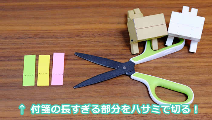 ↑こんな感じに、付箋をハサミで切るだけでオリジナル付箋の完成です! 付箋の黒い点線部分が接着面なので、それより上の長すぎるところをカットします。