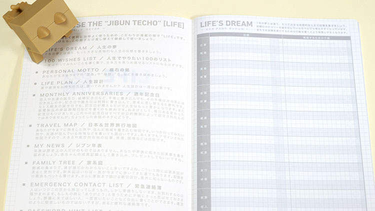 「LIFE」ではジブン手帳miniやBizに含まれている項目もありますが、デザインが違うものもちらほら。