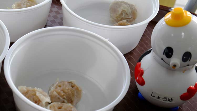 工場見学の最後は試食タイムです!! 2種類のシウマイを食べ比べできます。「昔ながらのシウマイ」2つと、ちょっと大きめの「特製シウマイ」1つ。できたてアツアツです!