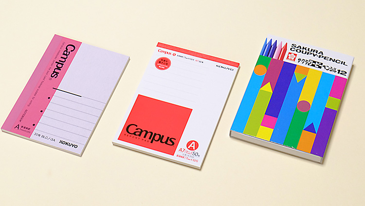 思わず一目ぼれした文房具がこちらのシリーズです! 左から「キャンパスノート、キャンパスレポートパッド、サクラクーピーペンシル」の3点です。学生時代にお世話になった、ちょっと懐かい文房具。一見なんの変哲もない、普通ノートとペンに見えますが…