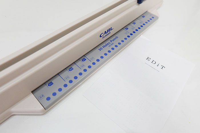 ルーズリーフパンチで一気にルーズリーフ化していきます。穴の位置を合わせないと凄いズレて使いにくいので丁寧に作業。