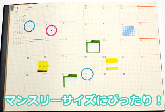 スケジュール帳のマンスリーサイズにぴったり!1マスにピタッとはまるので、予定を書くのにちょうどよいサイズ。