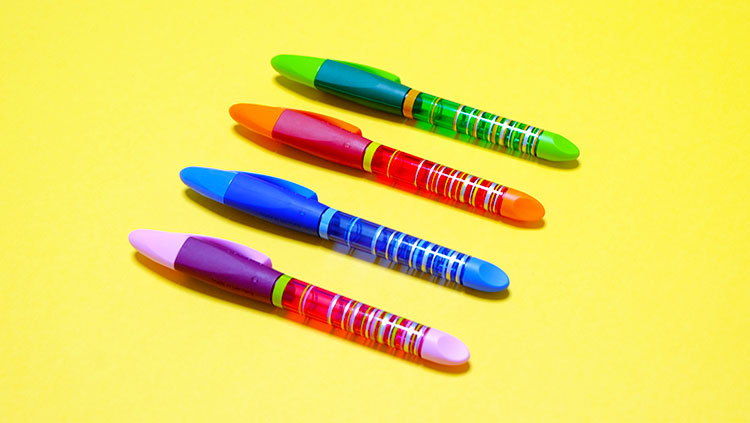 ペンを持つ感覚は、子供用のペリカン万年筆(ペリカーノジュニア)に近いイメージです。三角形のボディーが持ちやすく、描き心地もたまりません!