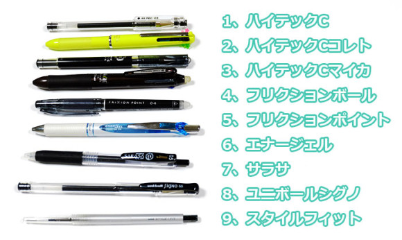 今回、書き心地&裏移りを比較する水性・ゲルインキボールペンは9本。それぞれの基本情報はこちら!