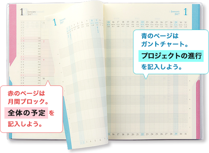 ダブルスケジュール進行は、ガントチャート式のプロジェクトページと、罫線入りの月間ブロックが1つになった手帳です。赤いインデックスの「1月の月間ブロックページ」の次のページには青いインデックスの「1月のプロジェクトページ」が交互になっています。