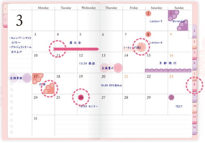 手帳と相性の良いシールは、スケジュール管理だけじゃなく種類やデザインも充実。インデックス・ライン・フレームにも使えるので、見やすく使い勝手の良い手帳にアレンジしてみてはいかがですか?